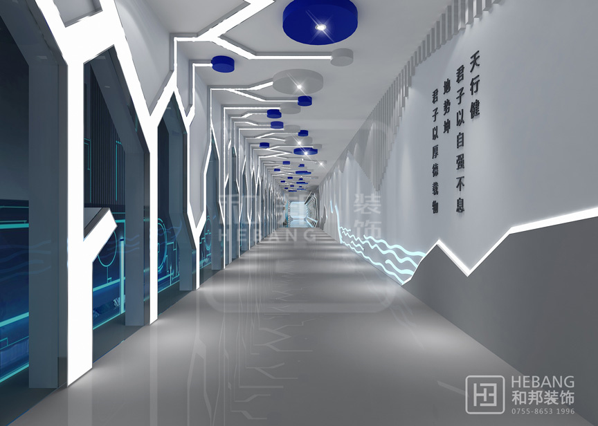 藍色貫穿于整個設計前后,讓人感覺干凈整潔。墻壁飾有的古代名言警句以及極富現代科技感的線條,行走在其中,像是穿越了古今,讓人流連往返。