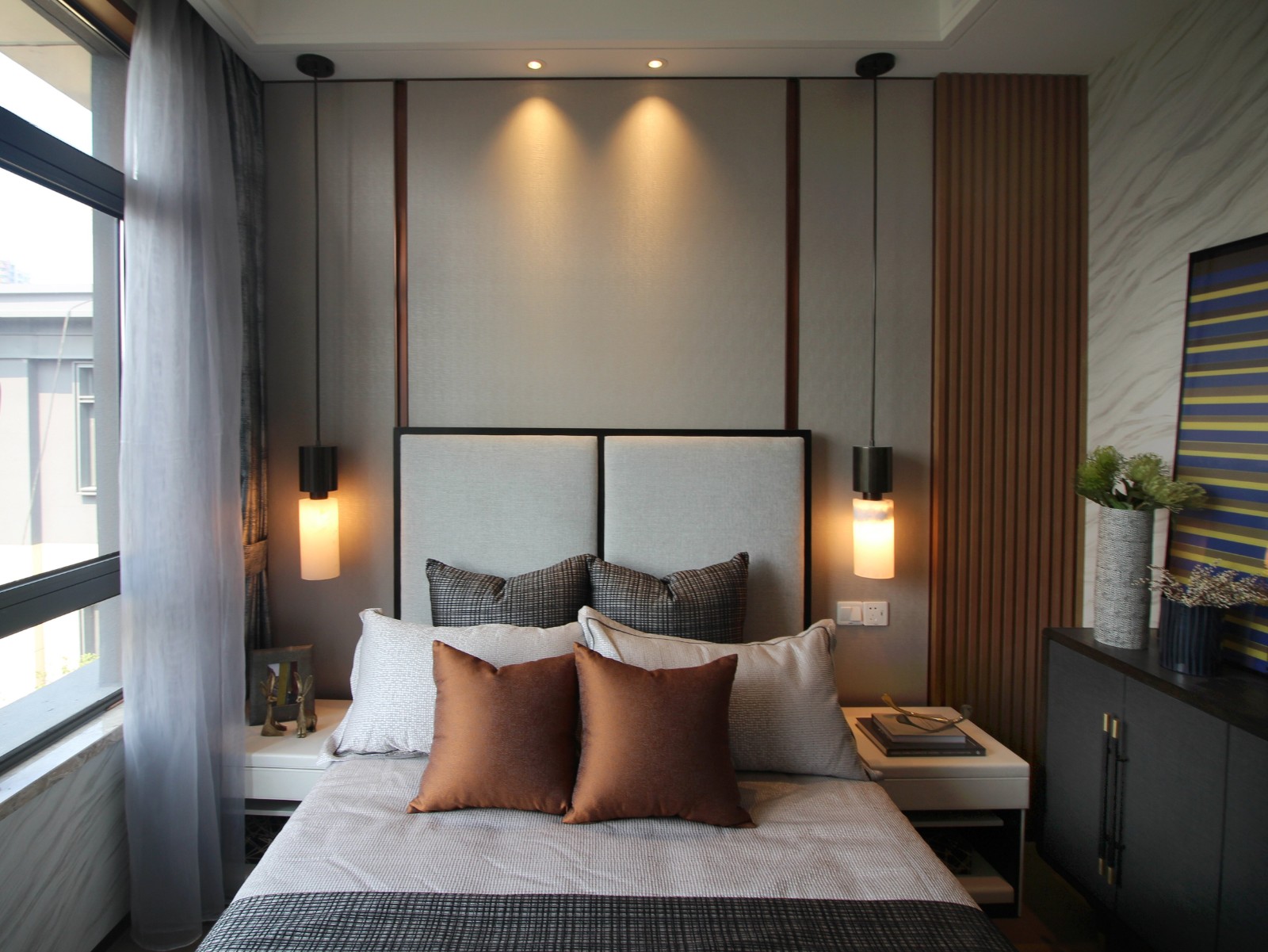 二層將建筑最好的陽光和庭院景色留給了長輩居住的空間。長輩房色調平穩舒適,以棉麻、木紋材質構成了空間的主要氣質。