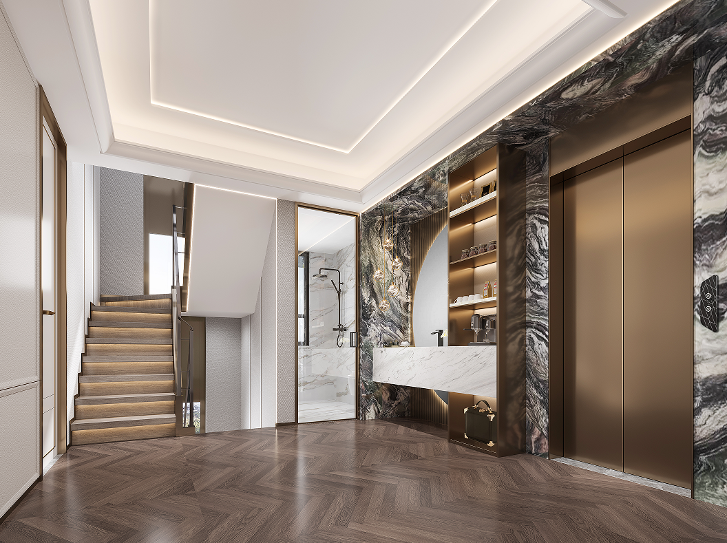 上疊一層多功能家庭活動室滿足聚會、觀影、沙龍等多樣化生活場景,紋理天然的背景奢石、鏡面水紋不銹鋼,幻化成熠熠生輝的發光源在空間中閃耀,為聚會增添了更為閃亮的氛圍。