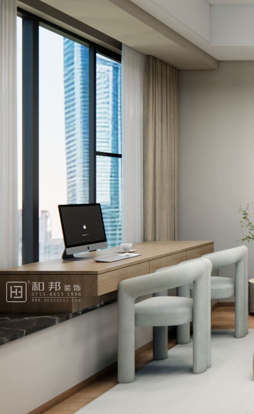 這是現代簡約風格的室內設計,以簡潔線條、中性色調為主,搭配大窗戶引入自然光線,營造開闊、舒適且具時尚感的空間,體現簡約大氣的居住氛圍 。